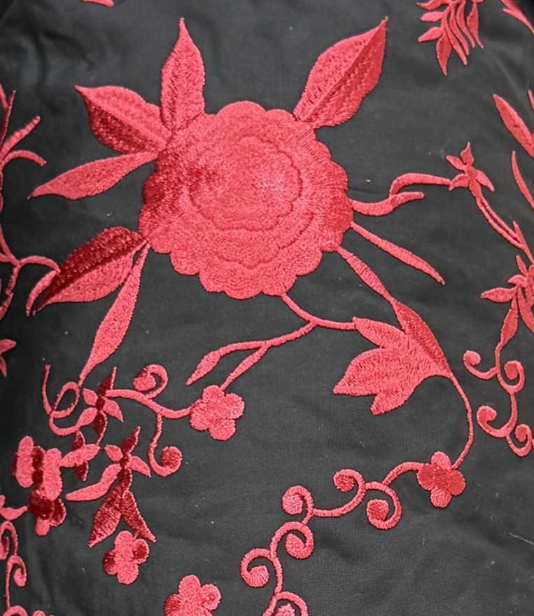 El bordado aplicado destaca por su volumen y textura, aportando profundidad visual y una presencia escénica muy marcada. Este tipo de tela flamenca es ideal para trajes de feria, espectáculos y diseños donde se busca fuerza, elegancia y un aire racial muy definido.
