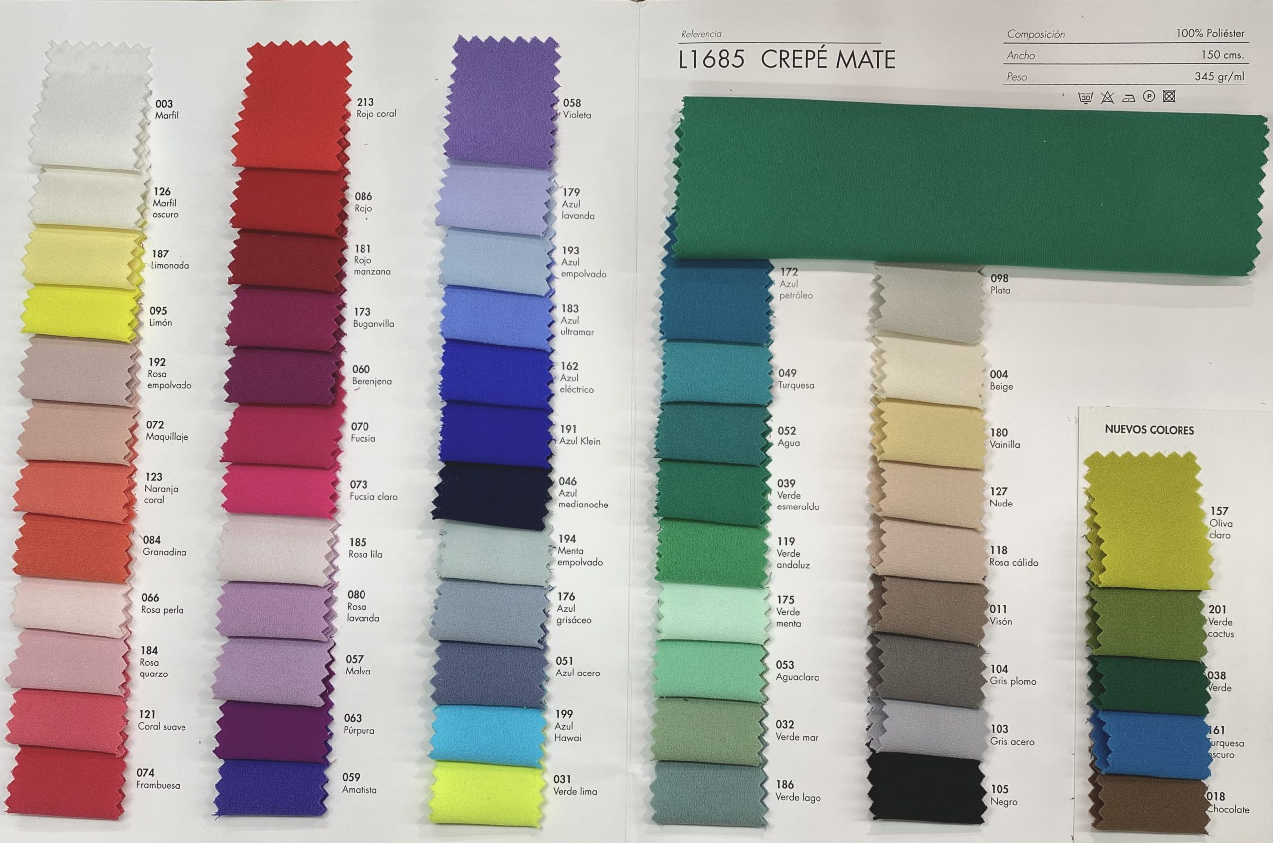 Tejido con 100% poliéster con elastán. Crepé mate de 150 cm de ancho, con acabado sin brillo y ligera elasticidad que mejora la adaptación y comodidad en prendas entalladas.
