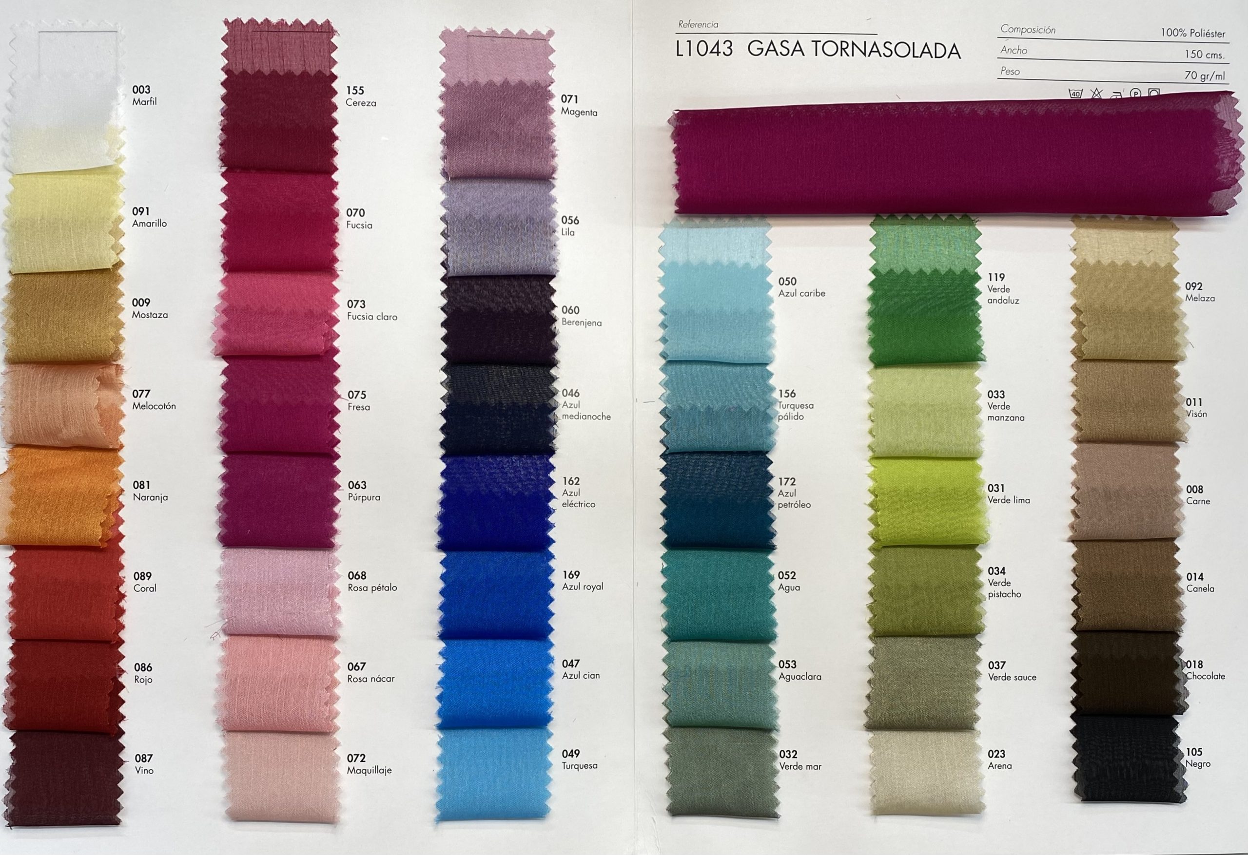 Tejido 100% poliéster. Gasa tornasolada de 150 cm de ancho, ligera y translúcida, con reflejos cambiantes que aportan luminosidad, ideal para moda de fiesta, ceremonia y detalles elegantes.