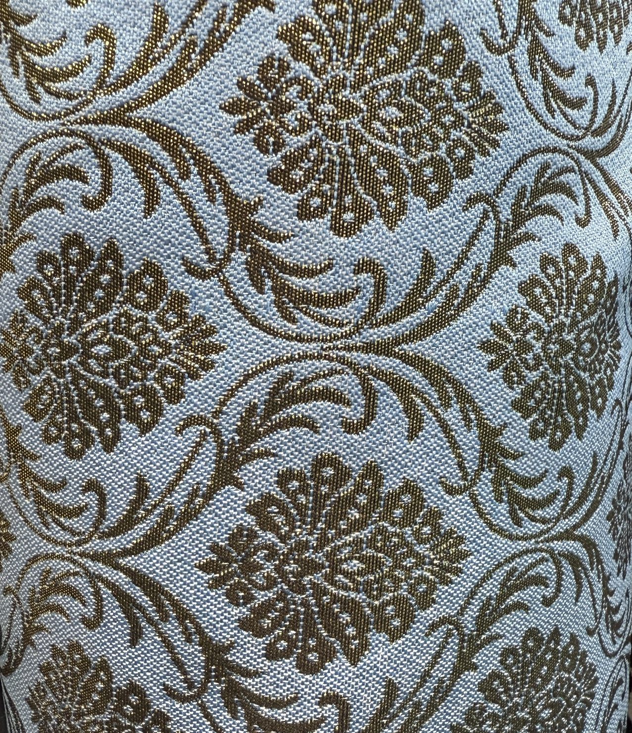 Tejido jacquard de estilo clásico, con motivos florales ornamentales en tono dorado oliva sobre fondo azul grisáceo. Elegante y versátil, ideal para tapicería, cortinas y complementos decorativos.