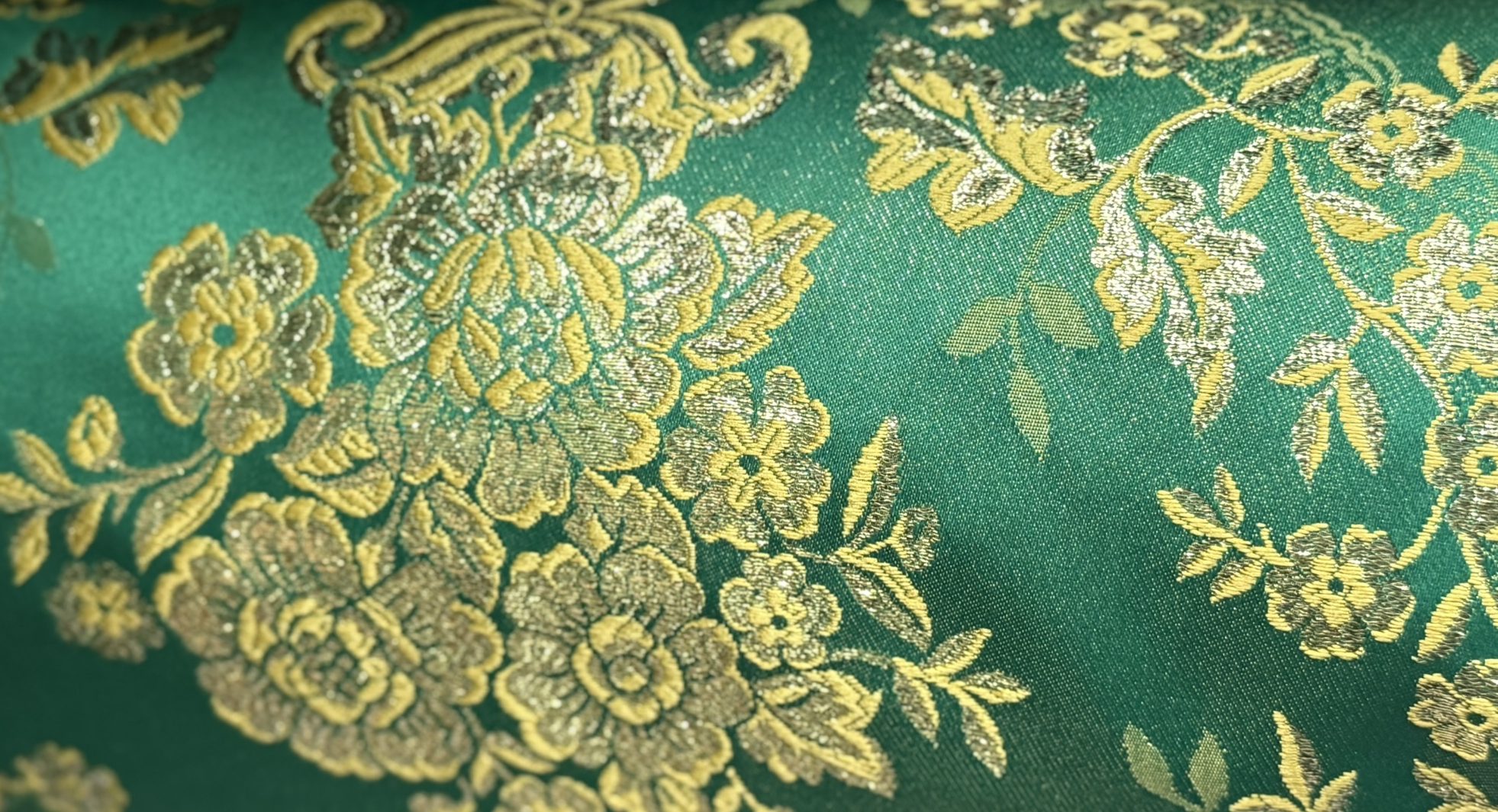 El contraste entre el verde intenso del fondo y el brillo cálido del dorado aporta una presencia notable y sofisticada, evocando tejidos de carácter noble y ceremonial. El bordado presenta un relieve definido y agradable al tacto, mientras que el fondo satinado aporta suavidad y una caída fluida que realza el conjunto.