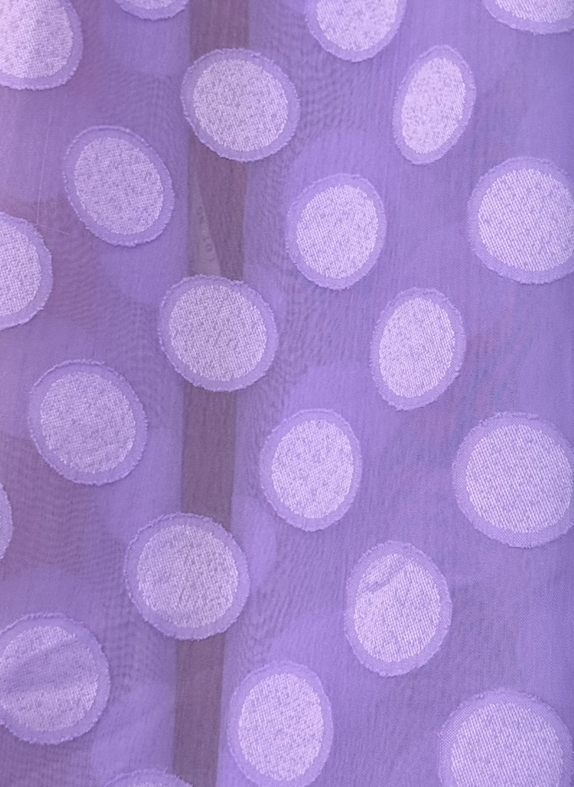 El tejido es ligero y vaporoso, con una caída fluida que realza el movimiento natural de los volantes y faldas. El lunar integrado a tono aporta textura y profundidad visual sin resultar recargado, haciendo de esta tela una opción perfecta para diseños elegantes y actuales.