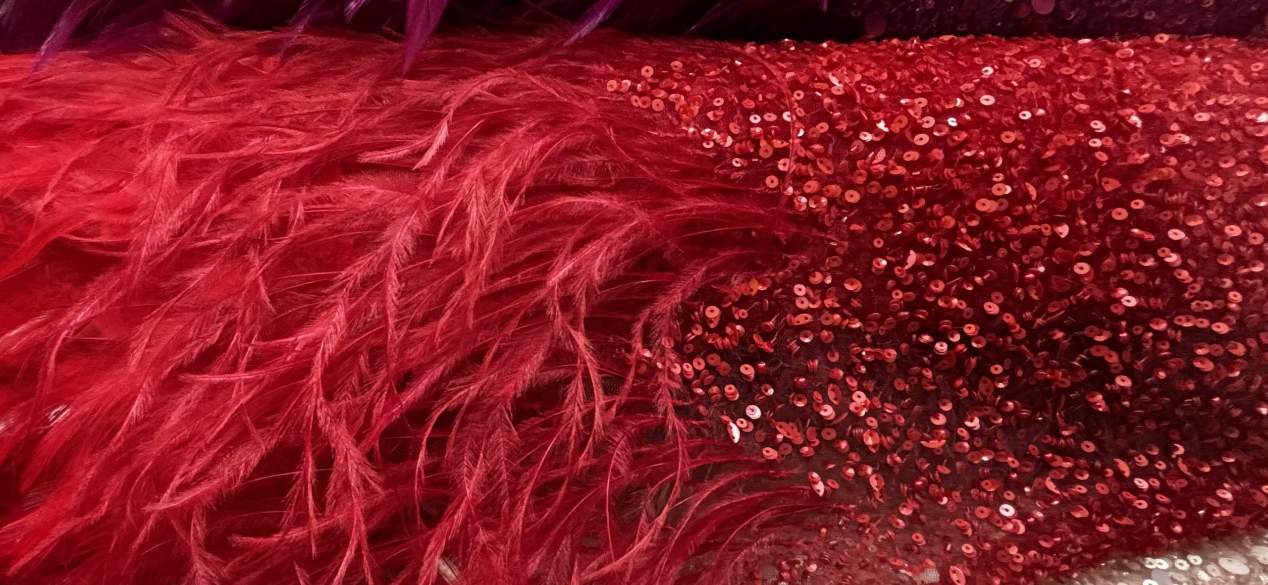 Este tejido es una elegante piedra con pluma de barabú en intenso rojo, diseñado para destacar. La base se adorna con piedras brillantes que aportan un efecto lujoso y refinado, complementadas por algunas lentejuelas que añaden sutiles destellos. Las plumas, suaves y vaporosas, aportan volumen, textura y un movimiento ligero que embellece cualquier prenda. Es el material perfecto para confección de vestidos de gala, cuerpos, chaquetas, faldas o detalles exclusivos de alta costura. Este tejido es ideal para ocasiones especiales, espectáculos o celebraciones donde se busca un diseño impactante y sofisticado. Una combinación única que realza el estilo y la personalidad de cada creación.