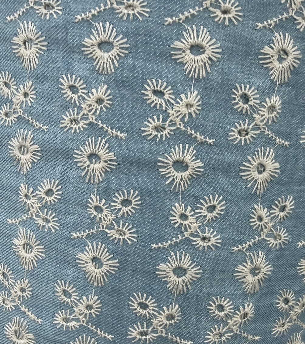 la Tela de Flamenca Bordada Margarita Azul Denim es un tejido de popelín con base azul tipo denim, decorado con un fino bordado blanco de flores estilo margarita, que aporta textura, relieve y un acabado artesanal muy elegante.