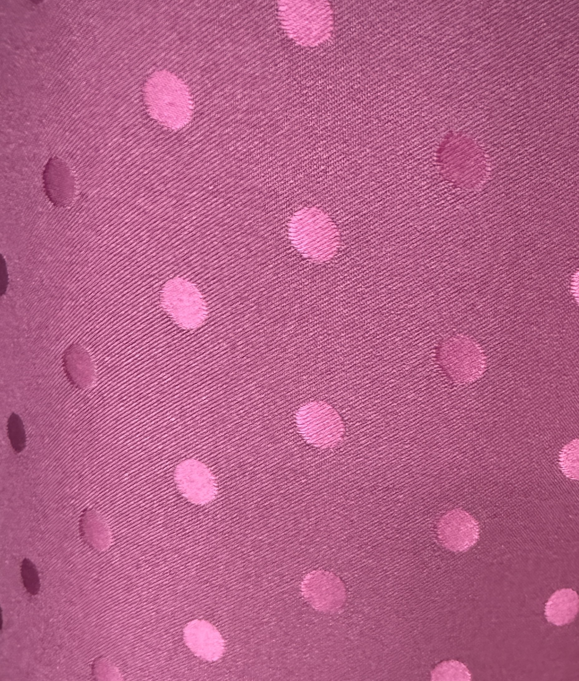 El contraste entre el fondo buganvilla y los lunares en rosa claro aporta un equilibrio perfecto entre fuerza y delicadeza, convirtiéndola en una opción muy atractiva tanto para diseños clásicos como para propuestas más modernas. Su estampado de lunares es regular y limpio, manteniendo la estética tradicional del traje de flamenca.