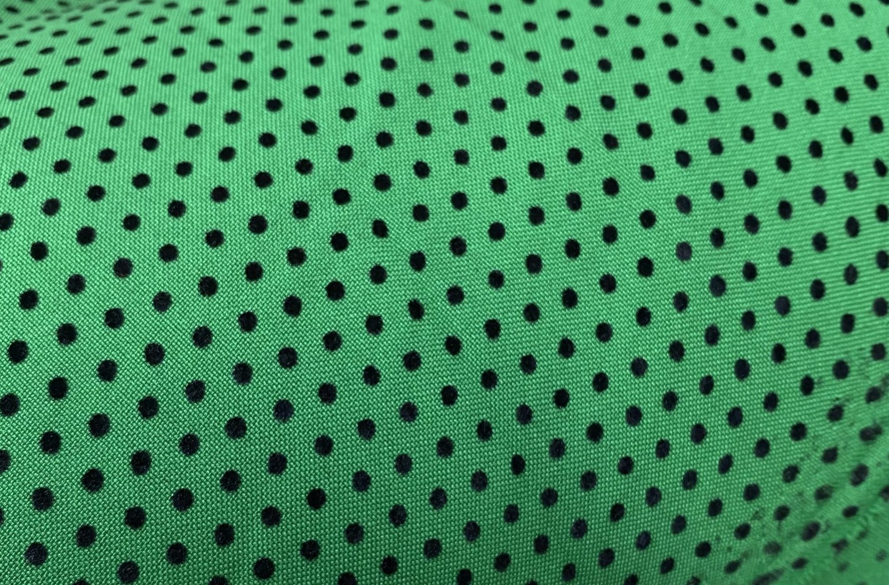 Este vibrante tejido en verde césped, también conocido como verde Andalucía, destaca por su elegancia y frescura. Decorado con un minucioso lunar negro flocado —con textura de terciopelo y tamaño de cabeza de alfiler— ofrece un diseño sutil pero con una fuerte personalidad. La textura aterciopelada de los lunares aporta profundidad y un atractivo juego visual al conjunto.