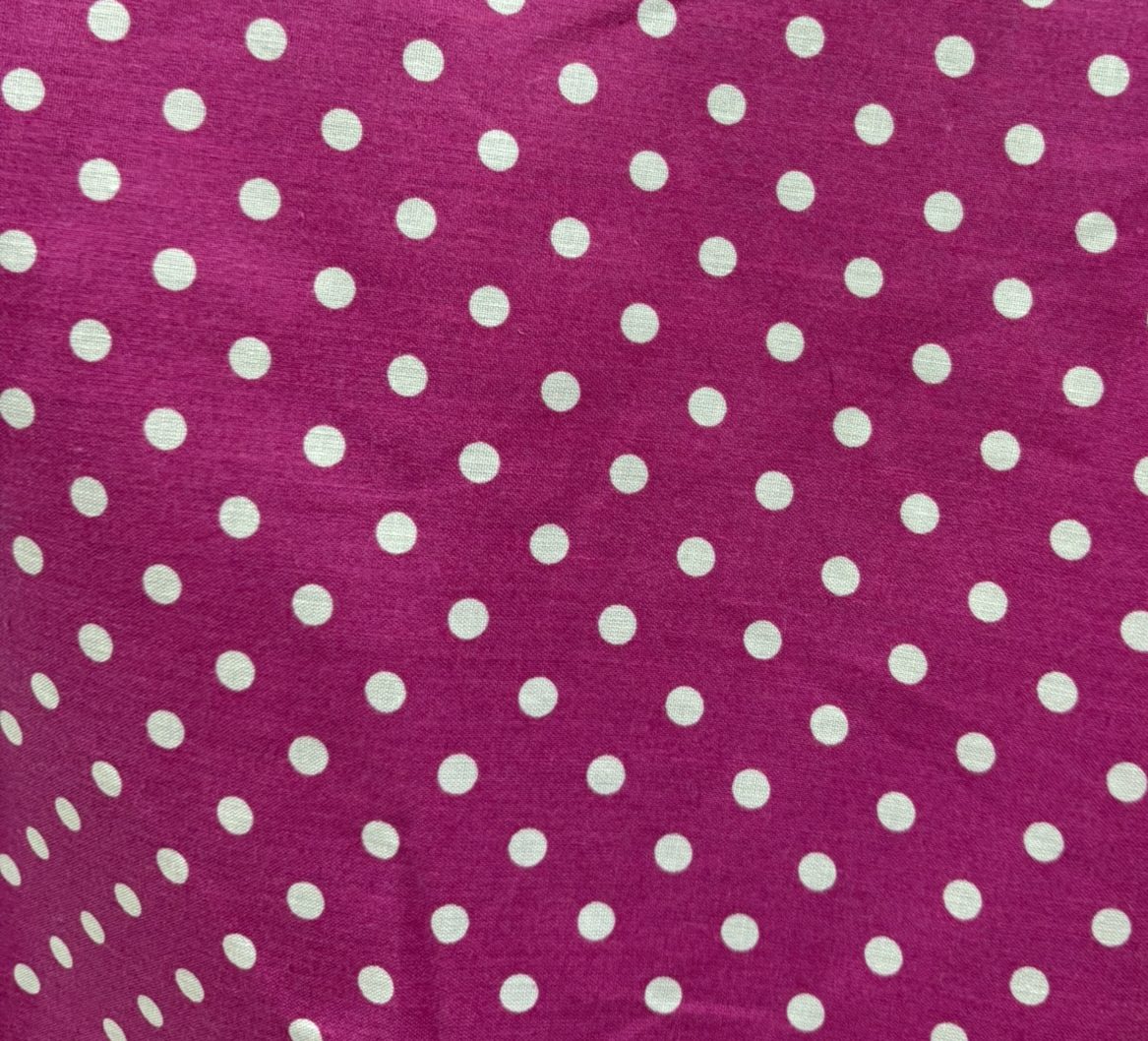 Tela de flamenca con fondo fucsia y lunares blancos, una combinación muy alegre y vistosa que representa a la perfección el espíritu de la moda flamenca.