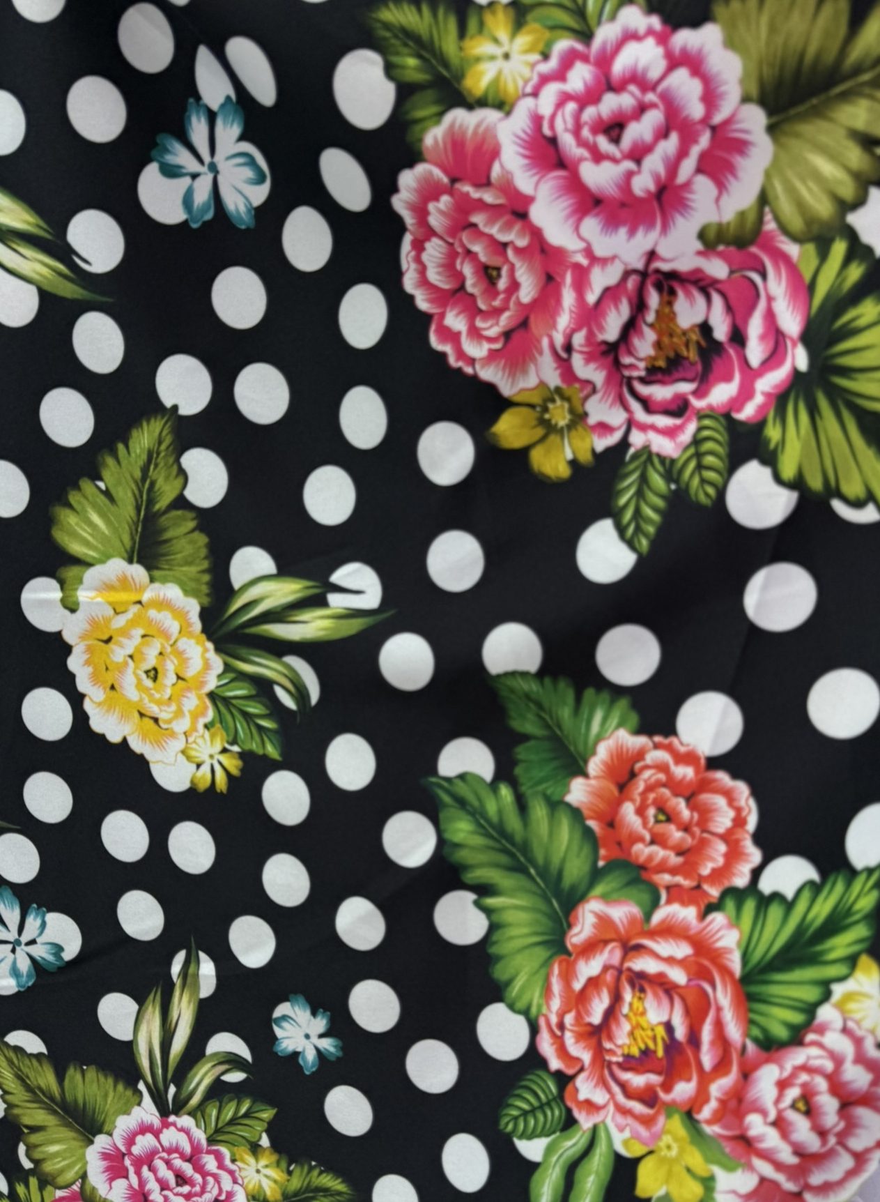 Tela de flamenca con un llamativo diseño que combina fondo negro con lunares blancos y grandes ramilletes de flores en tonos rosados, rojos, amarillos y verdes. Una mezcla muy flamenca que une dos de los estampados más representativos de la moda andaluza: el lunar y la flor.