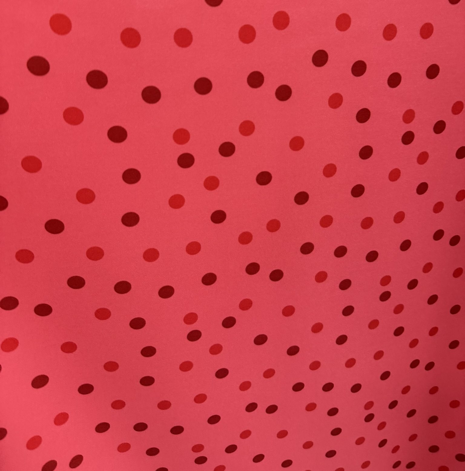 Tela de flamenca con fondo rojo y lunares en diferentes tonos de rojo más oscuro, una combinación elegante y muy flamenca que aporta fuerza y personalidad al traje.