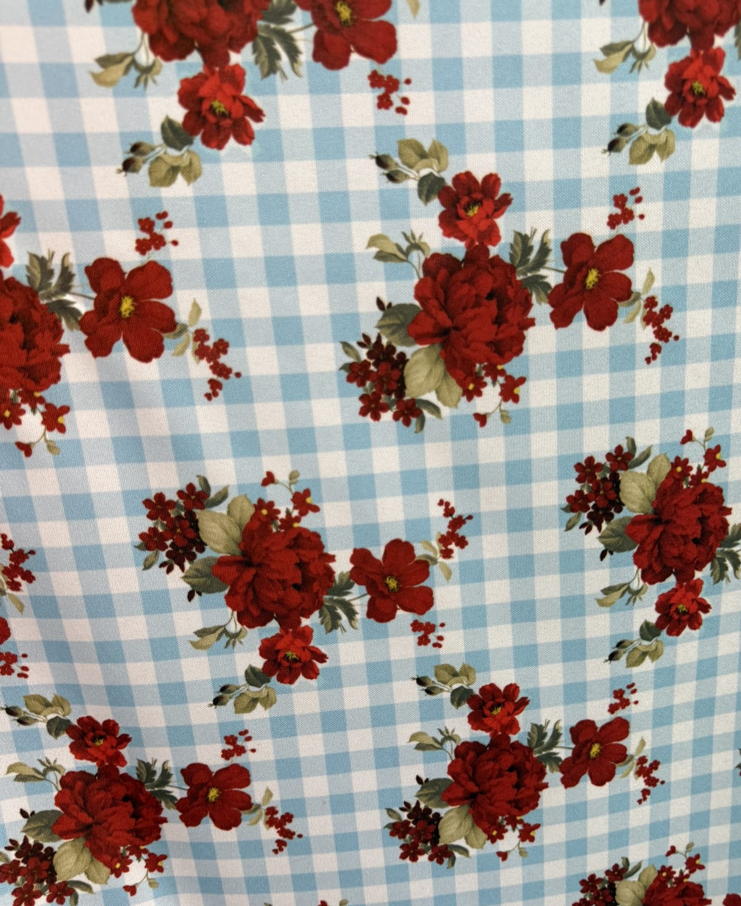 Tela de flamenca con un estampado muy alegre y tradicional que combina cuadro vichy celeste con ramilletes de flores rojas, creando un diseño lleno de frescura y carácter flamenco.