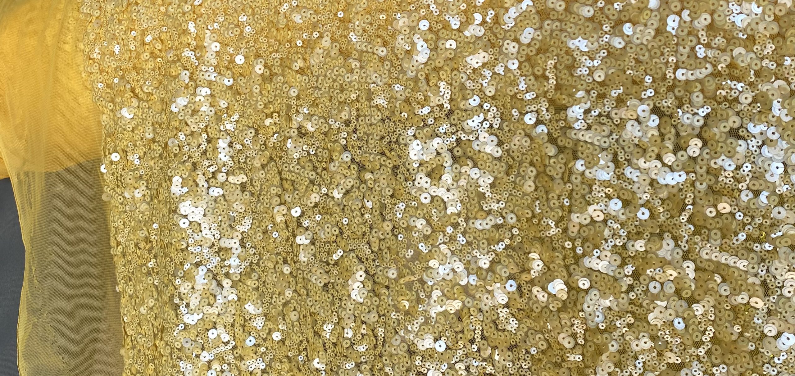 Tela completamente cubierta de pequeñas lentejuelas amarillas vibrantes, cosidas sobre tul elástico. Ligera, cómoda y con un brillo espectacular, es ideal para trajes de fiesta, espectáculos y alta costura.Si