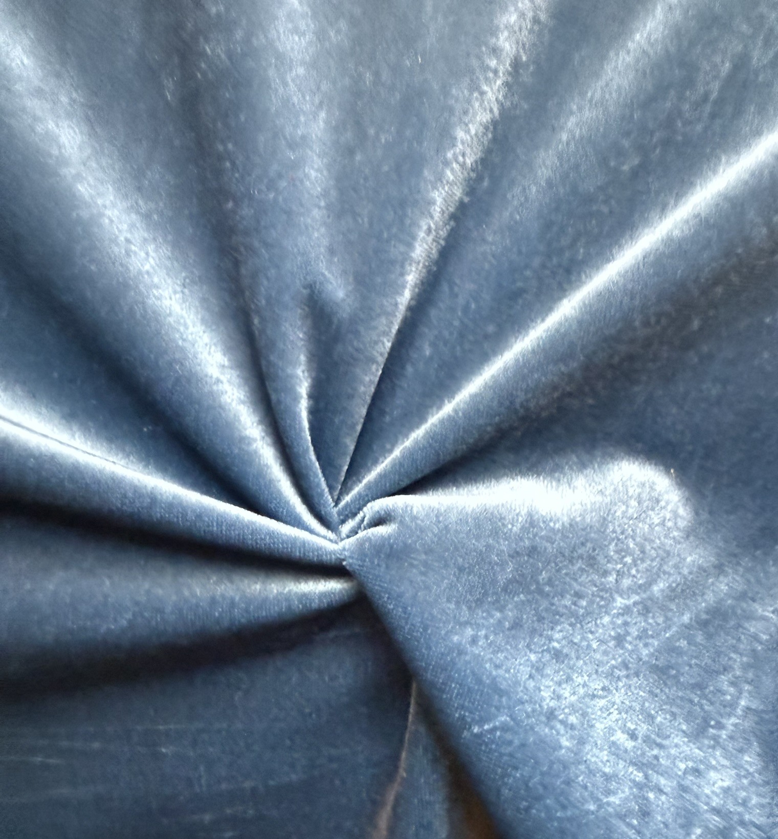 Su brillo es limpio y marcado en las zonas de pliegue, generando contrastes suaves entre luces plateadas y sombras más profundas. Este juego de reflejos aporta dinamismo a la superficie sin perder uniformidad. No es un azul vibrante ni eléctrico; es más bien un tono elegante, versátil y muy fácil de integrar tanto en moda como en decoración.